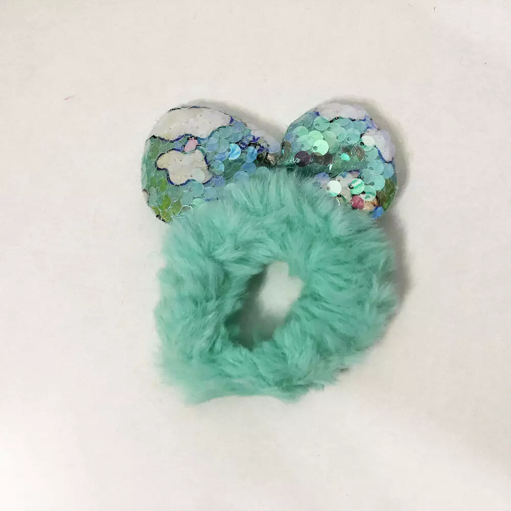 Резинка для волос из меха с ушками из ткани и пайеток. Цвет: бирюза