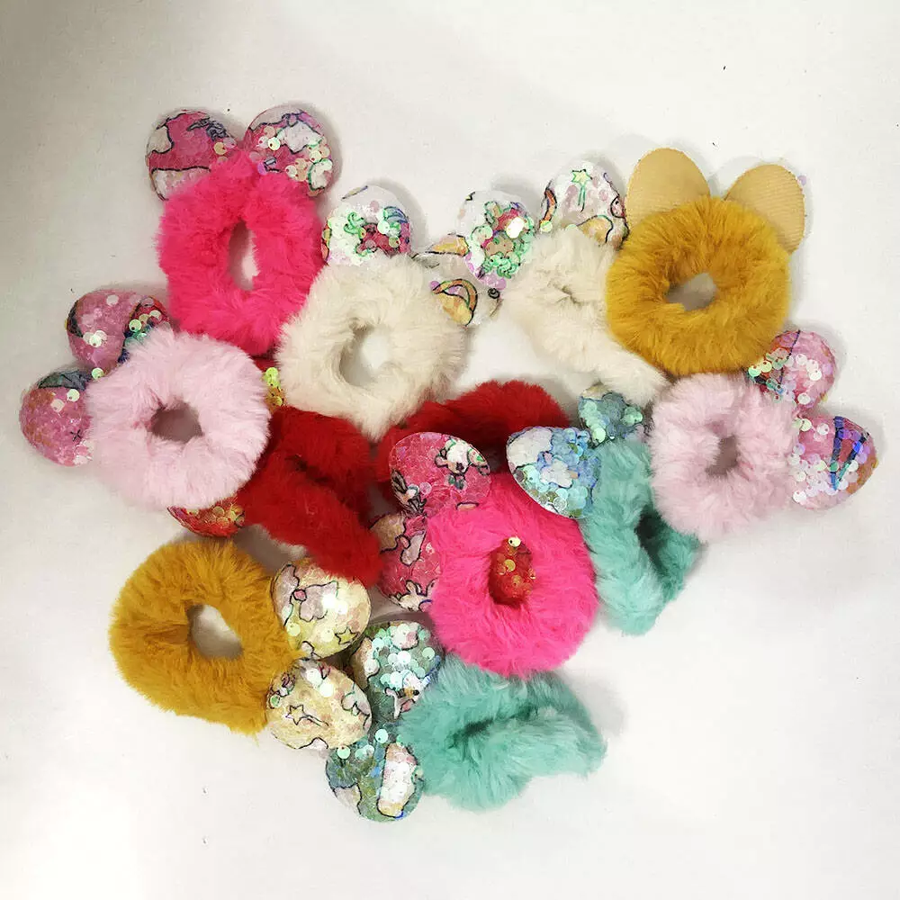 Резинка для волос из меха с ушками из ткани и пайеток. Цвет: красный