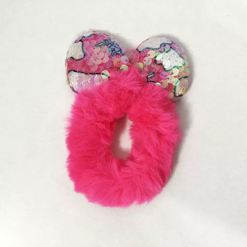 Резинка для волос из меха с ушками из ткани и пайеток. Цвет: темно-розовый