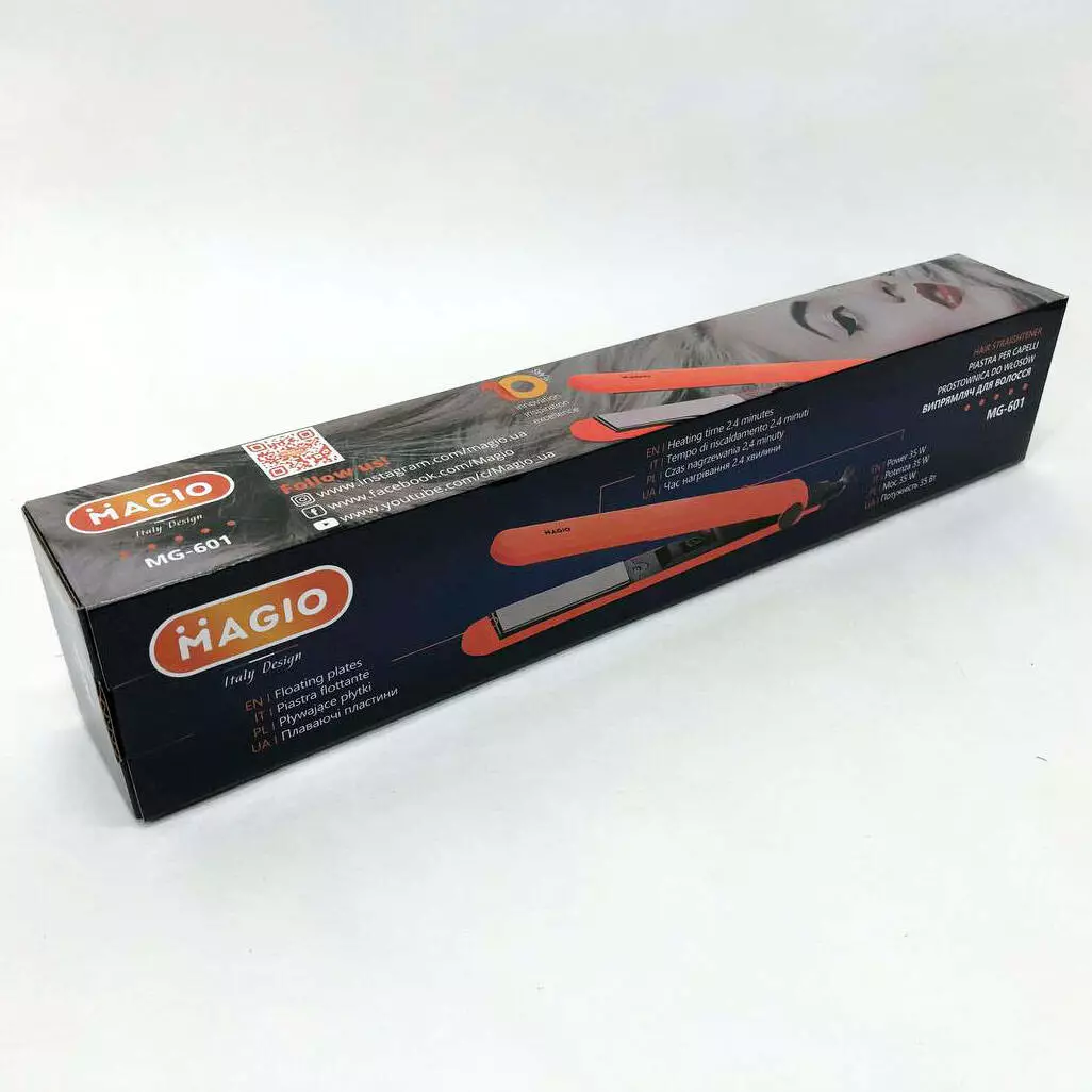 Выпрямитель для волос Magio MG-601 имеет стильный тонкий корпус. Абсолютная простота – ключевая особенность модели. Корпус выполнен из приятного на ощупь высококачественного пластика, который предотвращает плавление при нагреве и гарантирует длительный срок службы инструмента. Материал поверхности рабочих пластин - двухслойная керамика, что влияет не только на конечный результат прически, но и на здоровье волос. Такой вид пластин наносит наименьший вред, быстро и равномерно нагреваются, легко скользят по волосам и предотвращают электризацию. Выпрямитель оснащен удлиненными (90 мм) нагревательными пластинами шириной 24 мм, которые позволяют достичь идеальных результатов за более короткое время. Выпрямитель быстро нагревается и будет готов к использованию меньше чем за 1 минуту. Петелька для подвешивания и вращающийся шнур на 360° длиной в 1,8 м создают дополнительное удобство при использовании.