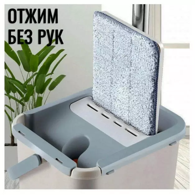 Швабра-лентяй отжимная с ведром и специальной крышкой, благодаря которой вы с легкостью вымоете и выжмете тряпку, не прикасаясь к ней руками и не снимая ее со швабры. От вас требуется всего несколько движений. Крышка создана таким образом, что выжать тканевую насадку можно, просто погрузив ее в специальное отжимное отверстие.