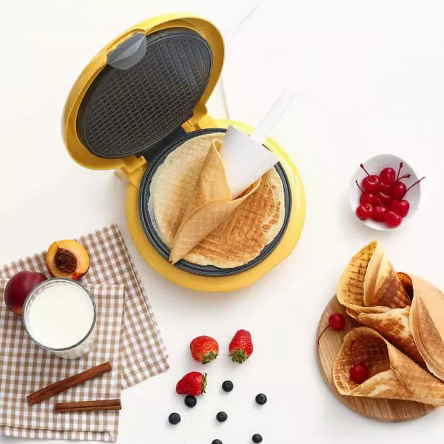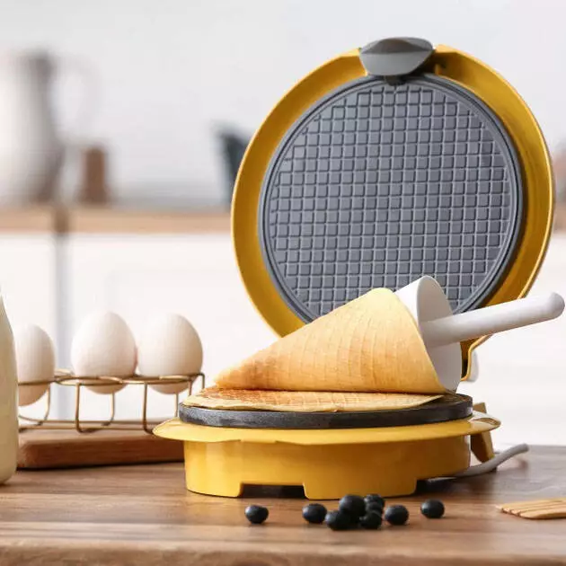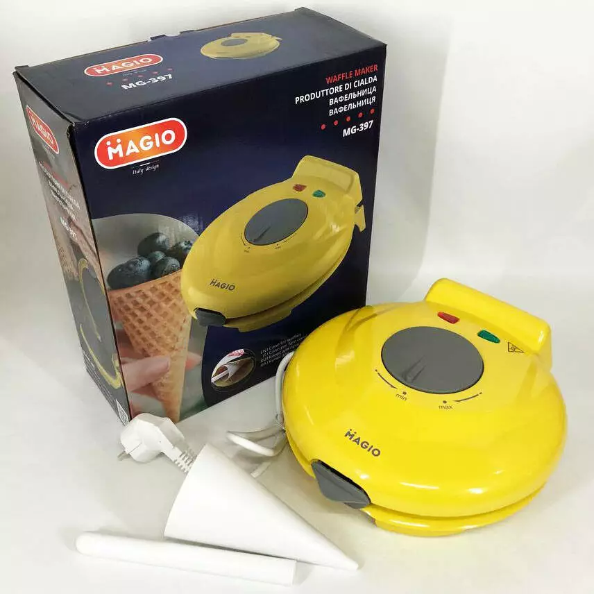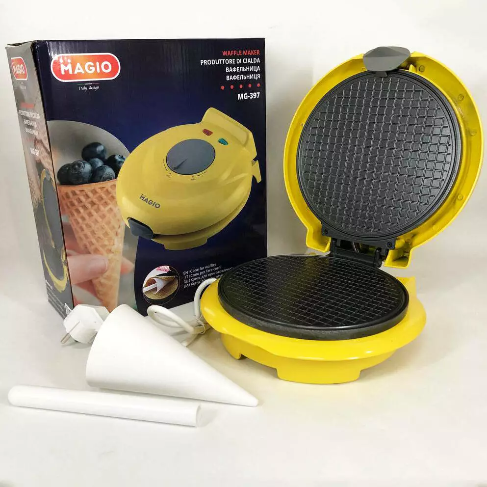Magio MG 397 – современная и стильная вафельница желтого с серым цвета, которая прекрасно впишется в интерьер Вашей кухни.