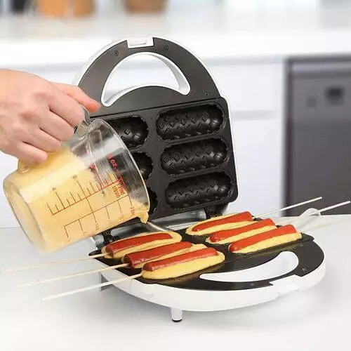Электро сэндвичница для Корн догов Domotec KB-888 – поможет одновременно приготовить 6 настоящих хот-догов всего за 20 минут! И это будет не просто сосиска, втиснутая в обычную булочку, а сосиска, запеченная в тесте по оригинальному американскому рецепту, который приводится ниже. Вы можете на 100% быть уверены в том, что в отличие от вредной еды фаст-фуд, ваши дети съедят качественную сосиску в тесте из натуральных ингредиентов без использования большого количества жиров. Так, вместо сосисок в тесте, можно запечь бекон или сыр, а также фрукты, орехи, шоколад. Попробуйте нанизать перечисленные продукты на палочки и вы увидите, сколько радости вызовут эти оригинальные лакомства у детей!