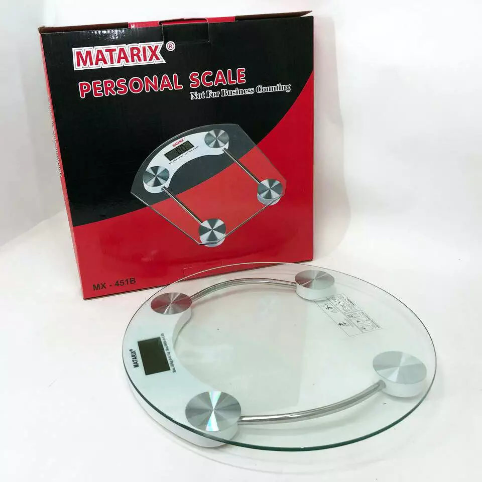 Весы напольные электронные MATARIX 451A с платформой из закаленного стекла. Платформа размером 33 х 33 см. Весы принадлежат к электронному оборудованию, они питаются от небольшой батарейки и имеют функцию анализа веса. Точность измерения весов допускает погрешность в 100 грамм. Максимальная нагрузка на весы -180 кг.
