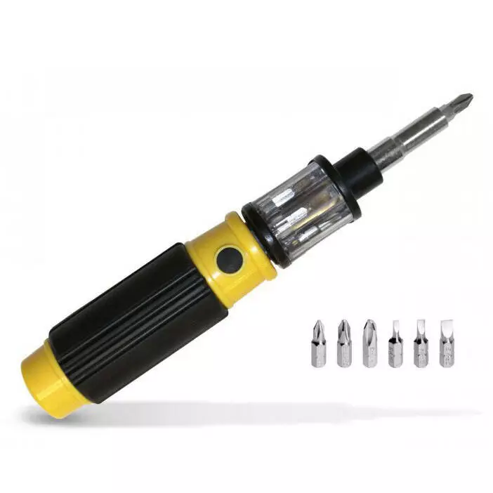 Отвертка «6 в 1» BIT 360 – это очень удобный универсальный многофункциональный инструмент, который вмещает в себе сразу шесть отверток с разным шлицем. Принцип работы инструмента BIT 360 заключается во вращении закрытой цилиндрической камеры с битами. Она оборачивается на 3600С, но при этом биты остаются внутри. Работать с инструментом под силу каждому – простым вращательным движением вытягивается держатель, устанавливается требуемая позиция биты и фиксируется в заданном положении. Купить отвертку 6 в 1 можно для дома, мастерской, автомобиля – она пригодиться везде.